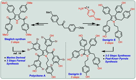 We report here the concise total syntheses of the densely substituted pyrrole-containing, marine-derived alkaloids denigrins E and D, together with the formal syntheses of polycitones A and B. Starting from p-methoxydibenzyl ketone, denigrin E was obtained in just two steps (44% overall yield), while denigrin D was synthesized in three steps (26% overall yield). In addition, the Steglich synthon, a key intermediate toward polycitones A and B, was accessed in three steps (34% overall yield), thus completing the formal synthesis of polycitones A and B. The overall efficiency of this route arises from the key transformation: a microwave-assisted Paal–Knorr pyrrole synthesis.