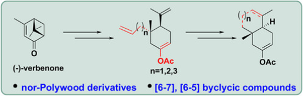 A 6-step synthetic route has been developed for the synthesis of trans-fused bicyclic, nor-polywood derivatives using a ring-closing metathesis as the key step. These newly synthesized trans-decalin derivatives exhibited the characteristic woody odor of this class of compounds. The corresponding and derivatives have also been synthesized to compare their properties with the trans-decalin derivatives. All the products were obtained with a high degree of chirality starting from (–)-verbenone as the chiral pool starting material.