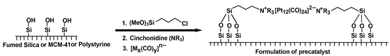 The synthesis of enantiomerically pure organic compounds via the asymmetric catalytic route has emerged as a major theme as biological activity of large number of drugs and agrochemicals is associated with one particular enantiomer. In this context, newer classes of polymer supported asymmetric nano-catalysts have been developed by ion-pairing anionic [Pt3(CO)6]n2 , [Ru4( -H)3(CO)12] and [Rh(CO)2Cl2] with the chiral quaternary amines onto the functionalized organic or inorganic polymeric supports (Scheme 6). The designed heterogeneous chiral catalysts are found to be quite efficient towards the enantioselective hydrogenation (ee >90%) of ketonic and olefinic functionalities. Moreover, newly designed water soluble polymer supported metal cluster derived catalysts are established to be remarkably efficient for both hydrogenation and oxygenation processes under environmentally bening reaction conditions.