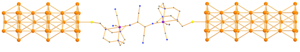 Fig. 1. Two terminal molecular junction device. Magnetic molecule is attached to gold electrodes through Au-S linkage.