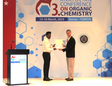 Dnyaneshwar Gorve receiving the Best Poster Presentation Award at the Anatolian Conference on Organic Chemistry (ACOC-3) organized by the Turkish Chemist's Society, Ataturk University, and Gebze Technical University at Antalya, Turkey from 13-16 March 2023..
