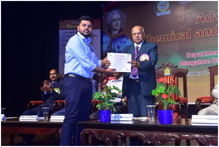 Praveen Kumar receiving the Best Oral Presentation Award at the International Conference onADVANCES IN CHEMICAL AND MATERIALS SCIENCE 2019 , organized by the Department of Chemistry, Mangalore University.